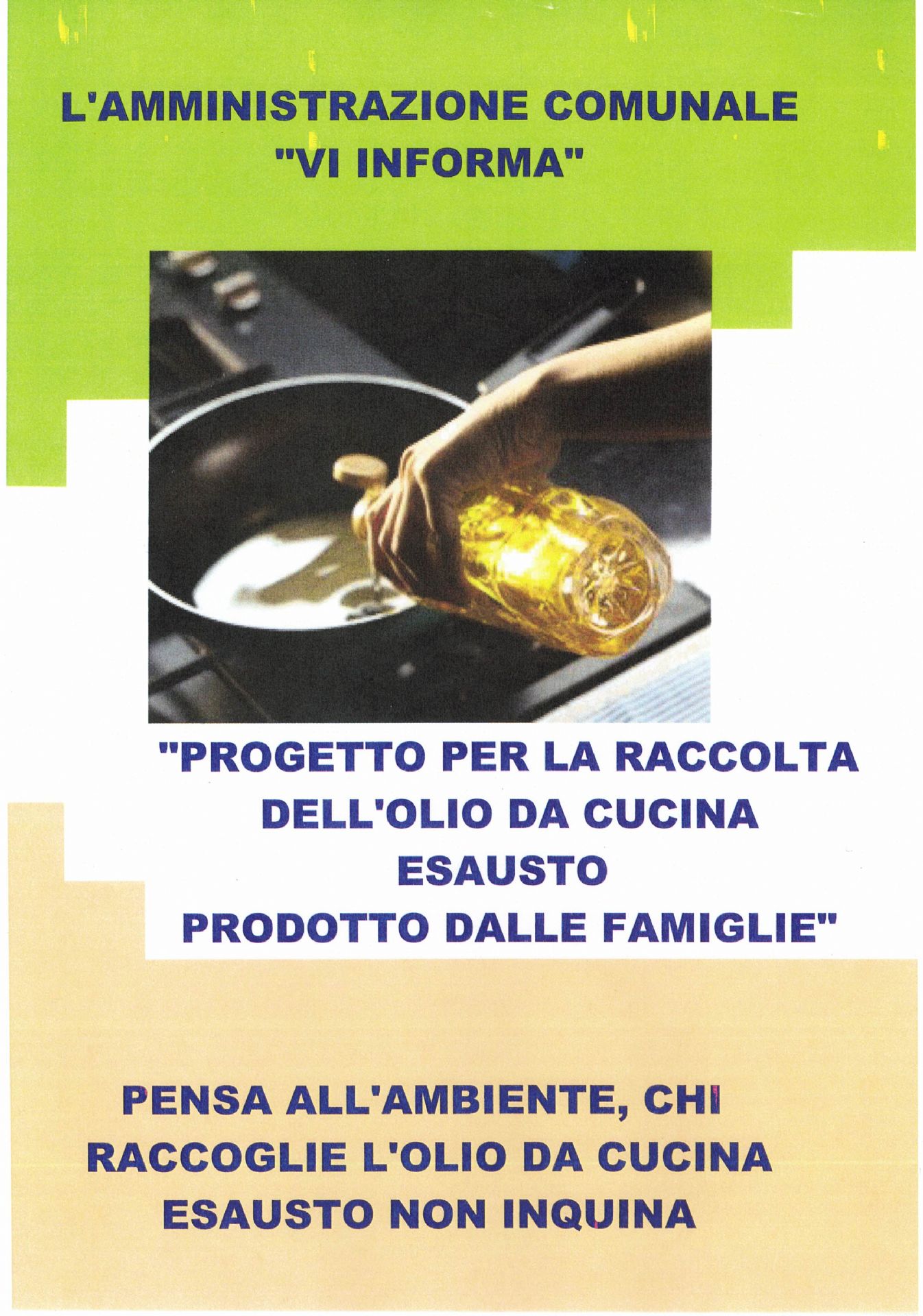 Si informa la cittadinanza che è possibile conferire, all'interno dell'apposito bidone, l'olio e grassi alimentari, chiusi in bottiglie di plastica, nel cortile del Comune dal lunedì al sabato dalle ore 9.00 alle ore 12.00 e il lunedì e mercoledì dalle ore 15.00 alle alle ore 17.00