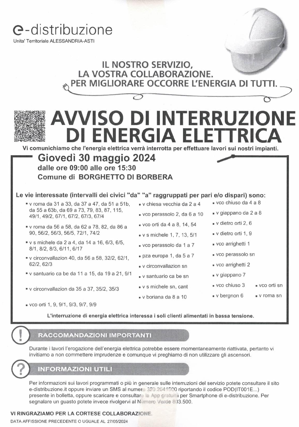 Avviso interruzione corrente elettrica giovedì 30.05.2024