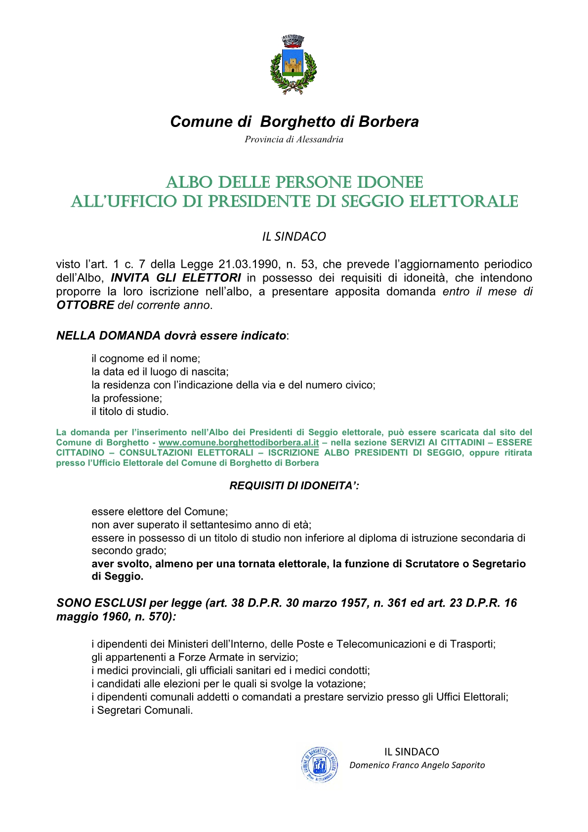 Al link sotto indicato è possibile consultare l'avviso per l'iscrizione all'Albo dei Presidenti di Seggio, e scaricare la relativa domanda.