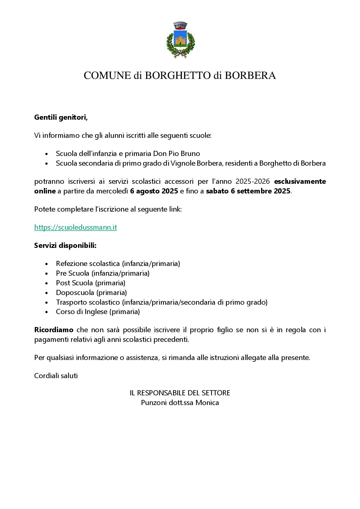 potranno iscriversi ai servizi scolastici accessori per l’anno 2025-2026 esclusivamente online a partire da mercoledì 6 agosto 2025 e fino a sabato 6 settembre 2025.
