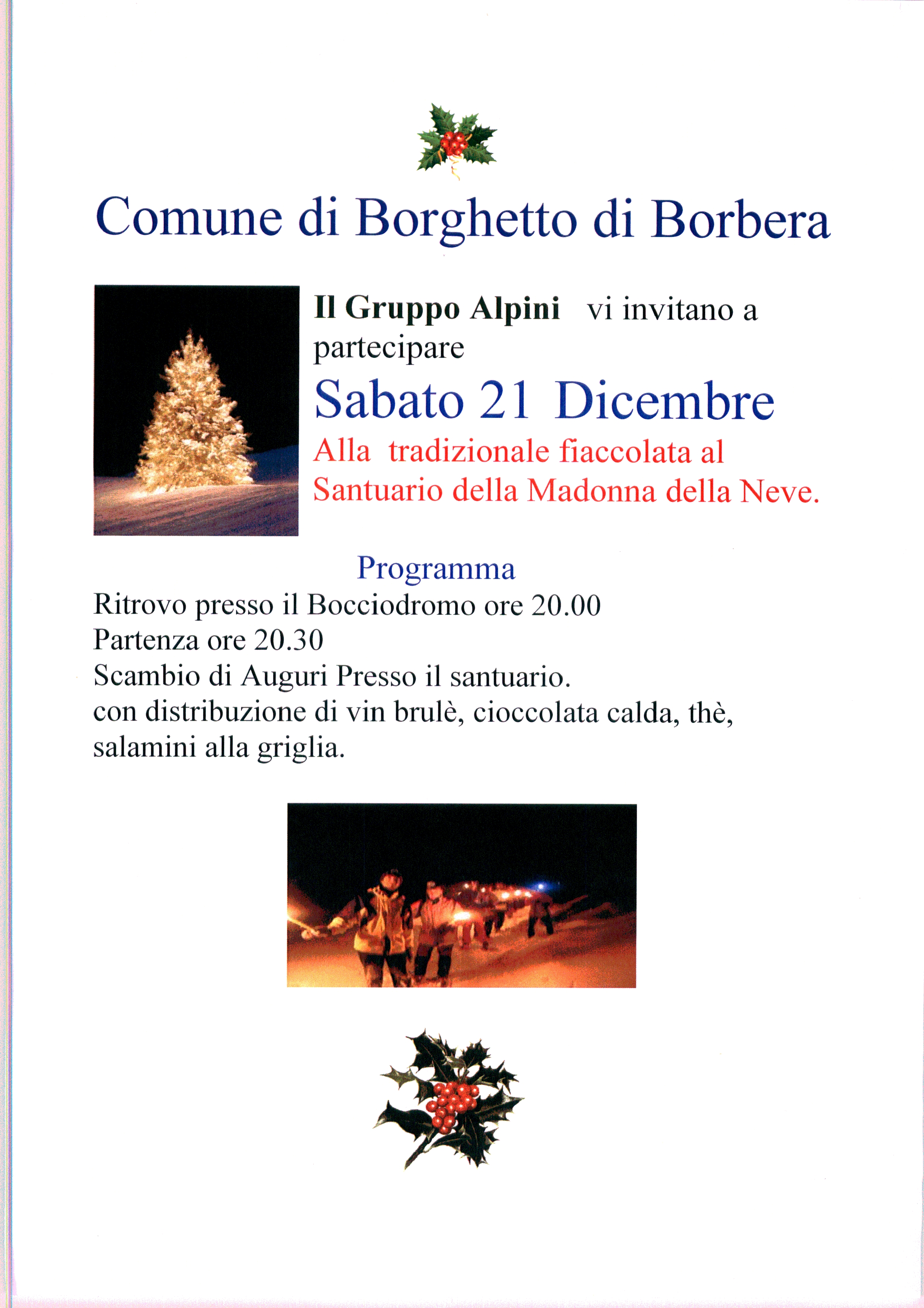 Come ogni anno tradizionale fiaccolata al Santuario della Madonna della Neve,ritrovo presso ex bocciodromo comunale alle ore 20 per la distribuzione delle fiaccole,partenza ore 20.30,all'arrivo distribuzione di vin brulè ,cioccolata calda e salamini a cura del gruppo alpini di Borghetto di Borbera.