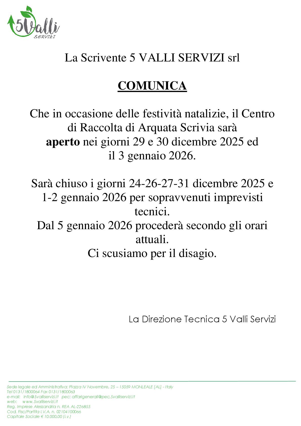 giornate di apertura e chiusura del centro di raccolta di Arquata Scrivia